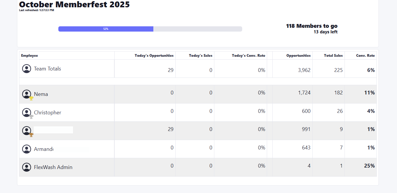 - Requirement for Single Wash Sales: If an employee does not record any single wash sales within a given week, they will not appear on the Leaderboard. This rule applies even if the employee has successfully completed membership sales during the same period.